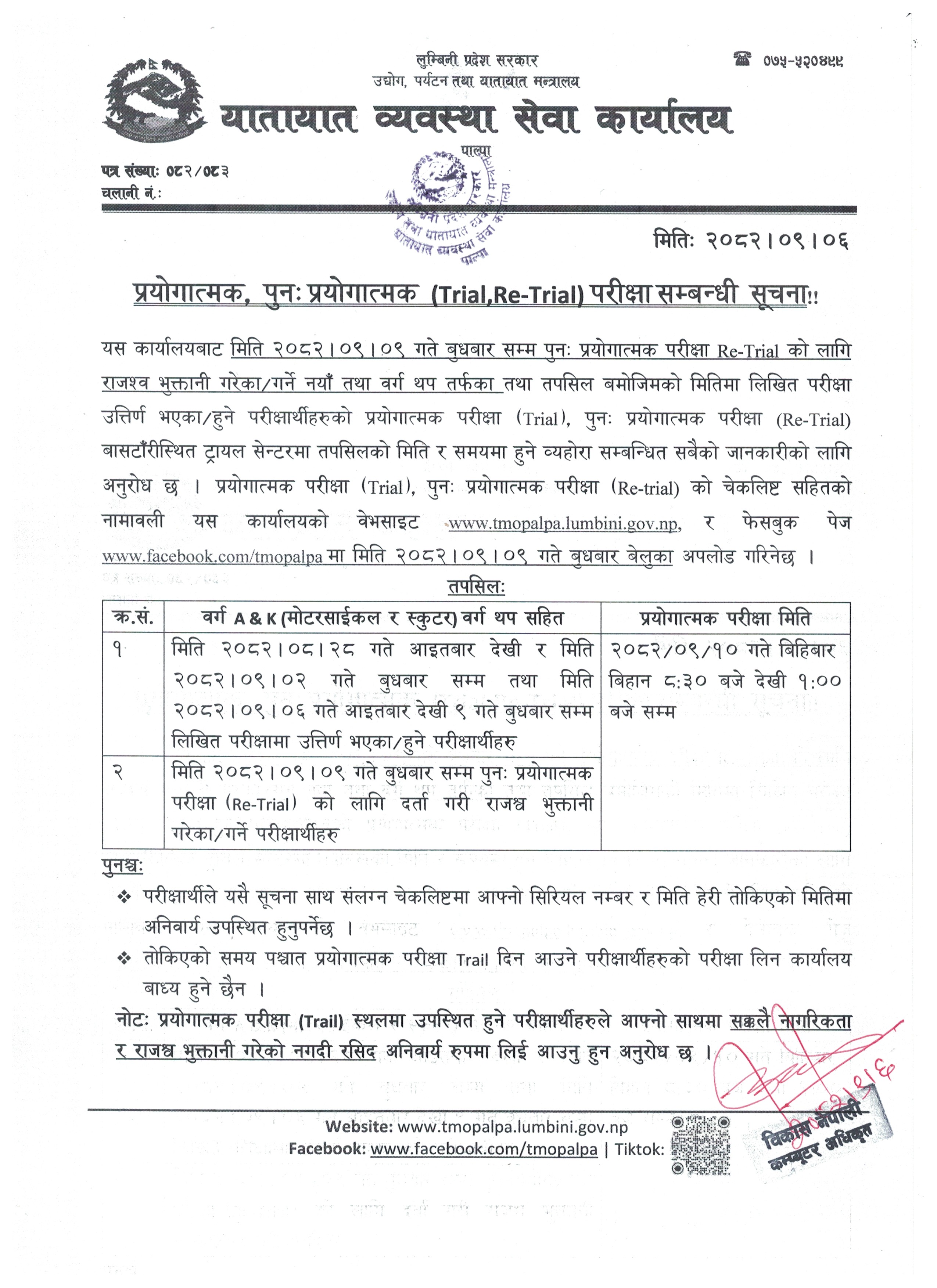 प्रयोगात्मक तथा पुनःप्रयोगात्मक (Trial, Re-Trial) सम्बन्धी सूचना !