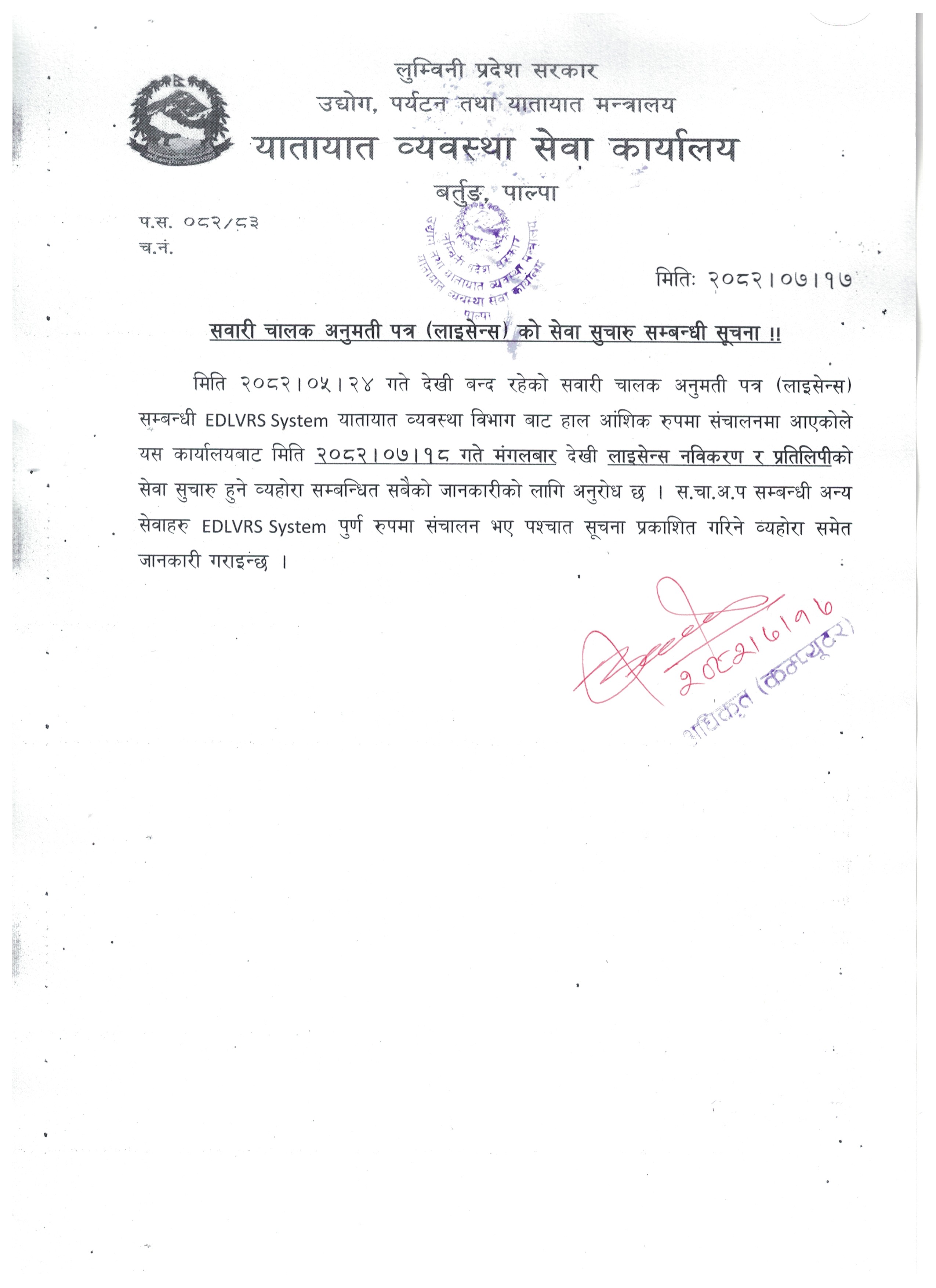 लाइसेन्स नविकरण र प्रतिलिपी सेवा सुचारु सम्बन्धी सूचना !