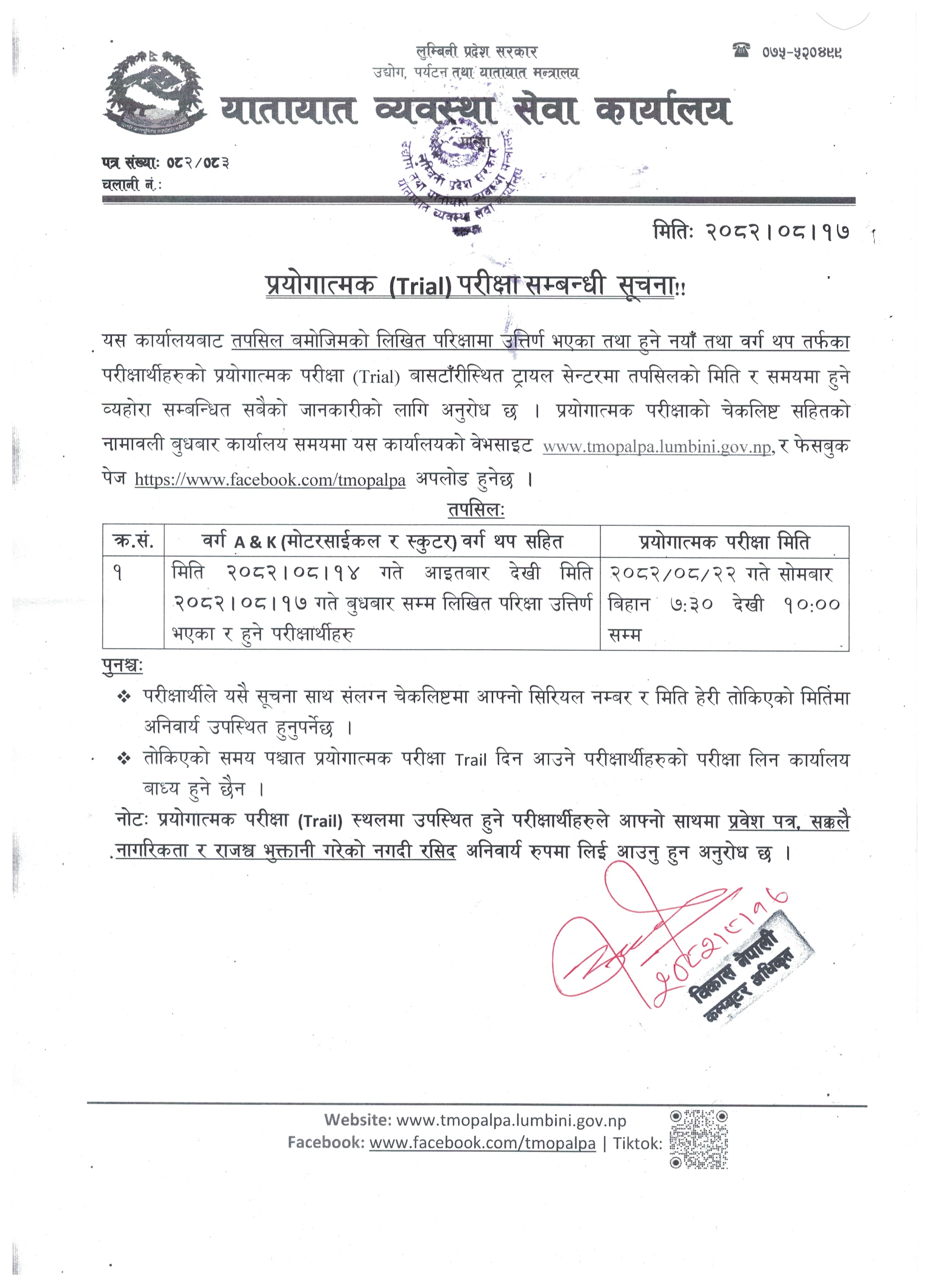 मिति 2082-08-22 गते सोमबार बिहान 7ः30 बजेको लागि तोकिएको प्रयोगात्मक परिक्षा (Trial) को चेकलिष्ट नामावली ।