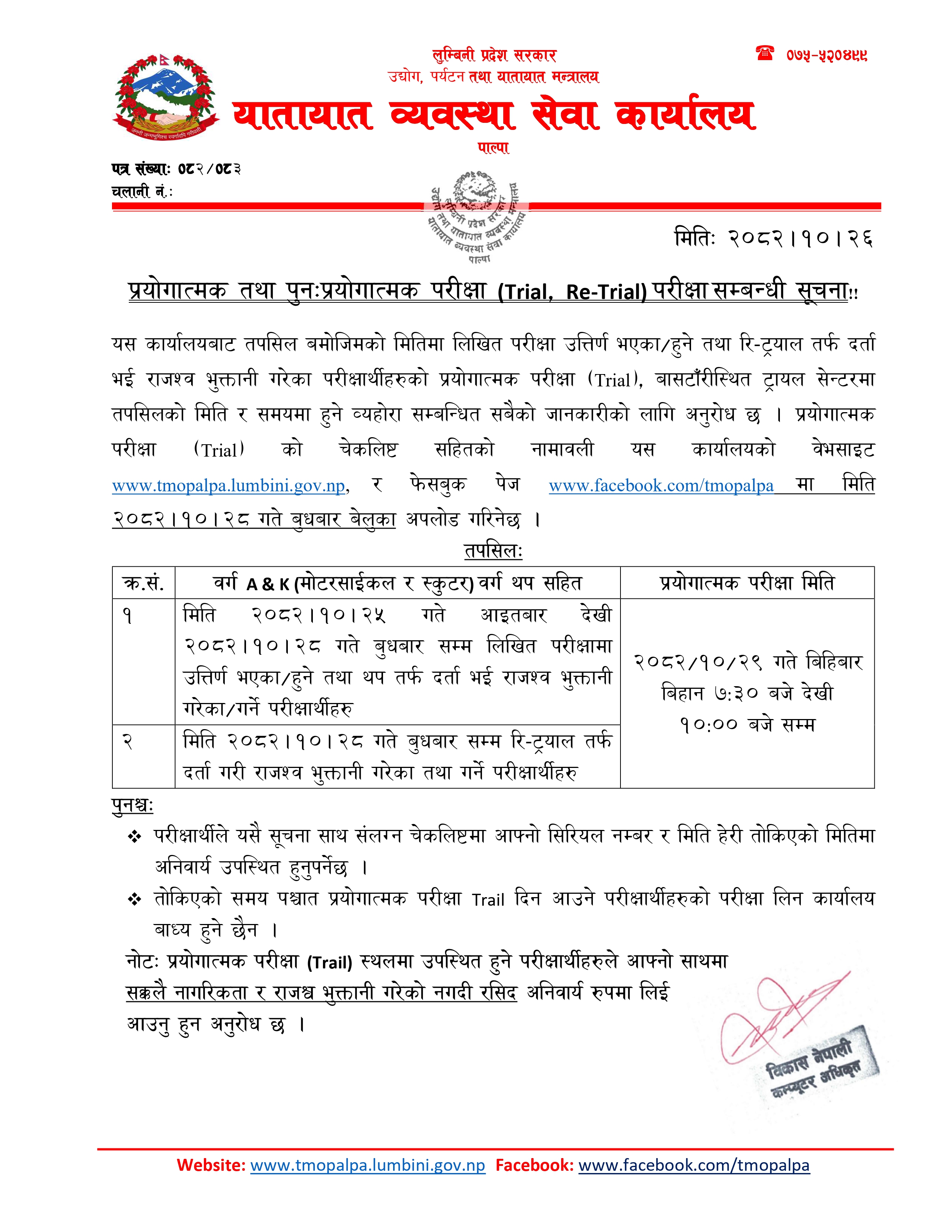 मिति 2082-10-15 गते बिहिबार बिहान ७ः३० बजे देखि सुरु हुने प्रयोगात्मक परीक्षा (Trial) को चेकलिष्ट नामावली ।